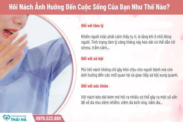 Dù không gây nguy hiểm gì đến tính mạng nhưng hôi nách có thể gây ra nhiều tác động tiêu cực khác, bao gồm: