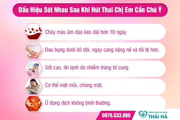 Sau khi thực hiện thủ thuật đình chỉ thai bằng kỹ thuật hút thai, chị em phụ nữ nếu có các dấu hiệu sót nhau bất thường dưới đây, hãy nhanh chóng đến các cơ sở y tế chuyên khoa uy tín gần nhất để được thăm khám và khắc phục nhanh chóng: