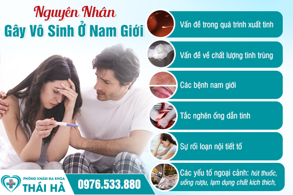 Vô sinh ở nam giới có thể xuất phát từ nhiều nguyên nhân, bao gồm cả yếu tố về sinh lý, sức khỏe tổng quát và các yếu tố khác tiêu biểu như: